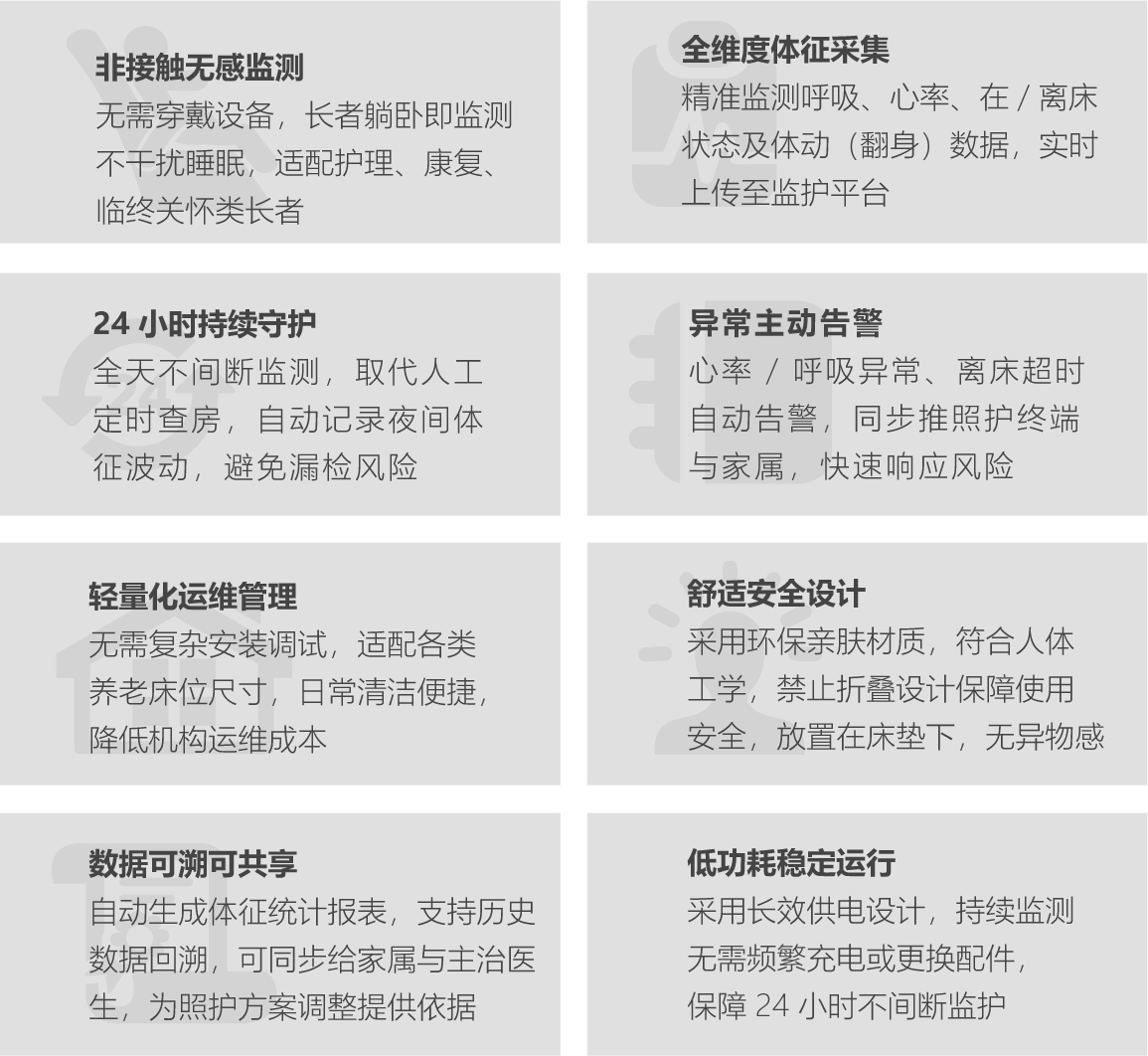24 小时体征监测,异常主动告警,让长者睡得安心,照护更省心